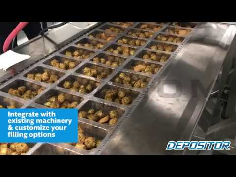 The Depositor container filling machine is designed to eliminate hand labor by automatically filling multiple product fill zones and is easily integrated with automatic thermoforming machinery and tray indexing conveyors.